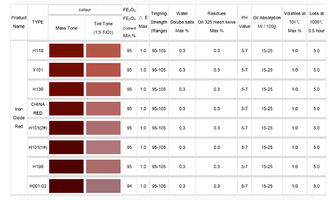 Chemical formula: Fe2O3. It is one kind of inorganic pigment, with high opacity, strong tinting strength as well as good dispersion. Its outstanding light resistance and weather proof make it attractive for a variety of applications such as in construction, rubber, painting etc.